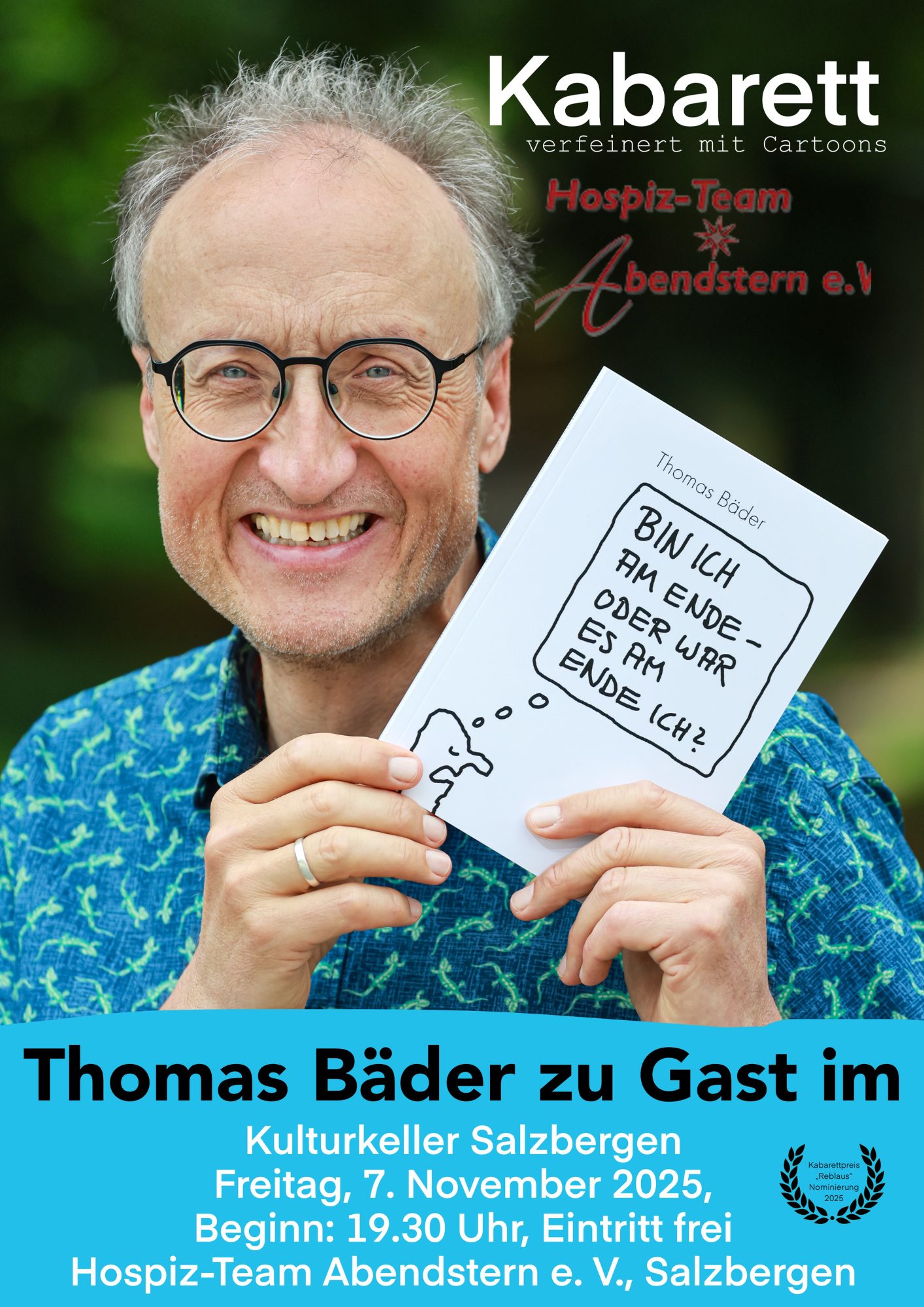 Thomas Bäder, 1970 in Tübingen geboren, lebt mit seiner Frau in Rosengarten (Baden-Württemberg). Als Autor hat der Künstler zwei Bücher veröffentlicht: „Bin ich am Ende – oder war es am Ende ich?“, Aphorismen und Notate – gewitzt mit Cartoons (2023) sowie „Der kleine Herr Mann“ (2017). Sein erstes Soloprogramm hieß „Das erste Buch Bäder“ (2019). Nun folgt mit „Bin ich am Ende – oder war es am Ende ich?“) das Zweite.